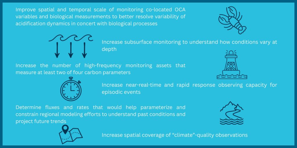 The Interagency Working Group on Ocean Acidification Monitoring Prioritization Plan 2024 calls for Coastal Acidification Networks to identify the ocean and coastal acidification (OCA) monitoring needs most important for their regions. The Northeast Coastal Acidification Network (NECAN) organized a webinar series to study regional needs, which culminated with a workshop in November 2023. This workshop led to the identification of six new monitoring needs in addition to the maintenance of current monitoring efforts: