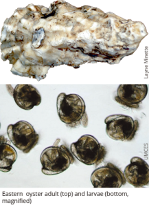 A number of studies have investigated the effects of OCA on bivalve species that occur in New England, although they have not all used individuals sourced from this region. The studies have found that all but the ocean quahog (Artica islandica) are negatively affected, exhibiting slowed shell growth and/or calcification, sometimes across multiple life stages. The research shows that the youngest life stages, or larvae, are especially vulnerable. While most juvenile and adult bivalves in this region seem capable of surviving OCA until it reaches extreme levels (pCO2 > 3,500 μatm), the larval stages are highly sensitive. In effect, OCA can cause the shells of tiny clams and other bivalves to disssolve or to not form at all. Such extreme levels routinely occur already, particularly within urbanized estuaries, and represent waters undersaturated with respect to aragonite, meaning Ωarag less than 1.0. Specifically, larval stages of the hard clam (Mercenaria mercenaria), eastern oyster (Crassostrea virginica), and bay scallop (Argopecten irradians) show elevated mortality at moderate-to-high levels of CO2 (750–1,500 μatm pCO2).